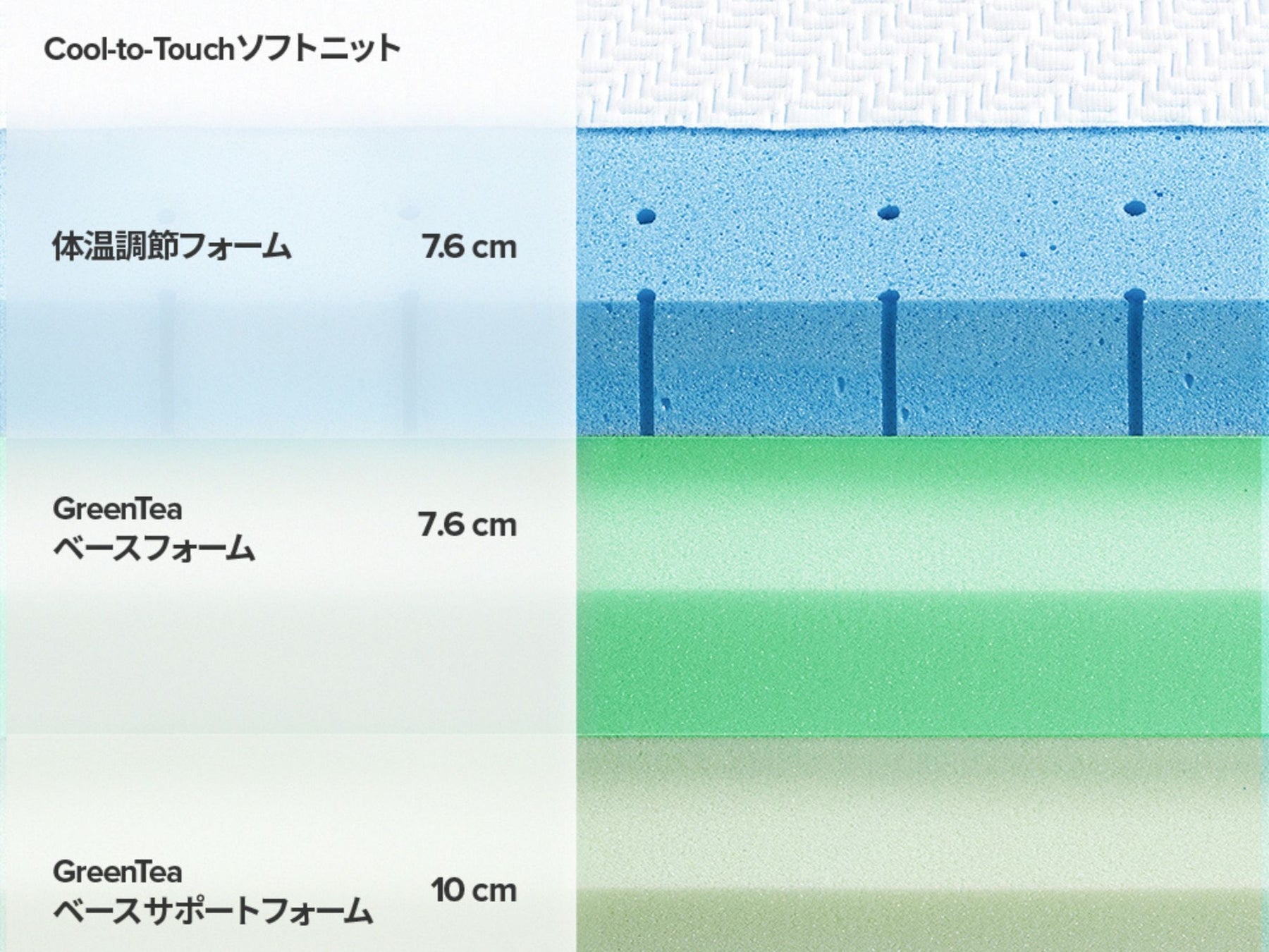 低反発フォームのしっとりと包み込まれる寝心地、体の部位ごとに適した硬さのフォームを組み合わせた7-ZONEシステムで自然な寝姿勢を叶えながら、体温調節フォームなどで熱の寝苦しさの軽減し、通年では汗をかきやすい方に快適な睡眠環境を提供します。また、天然の緑茶成分と活性炭成分を配合したGreenTea メモリーフォームで、毎晩、新鮮な気持ちで眠りに就けます。